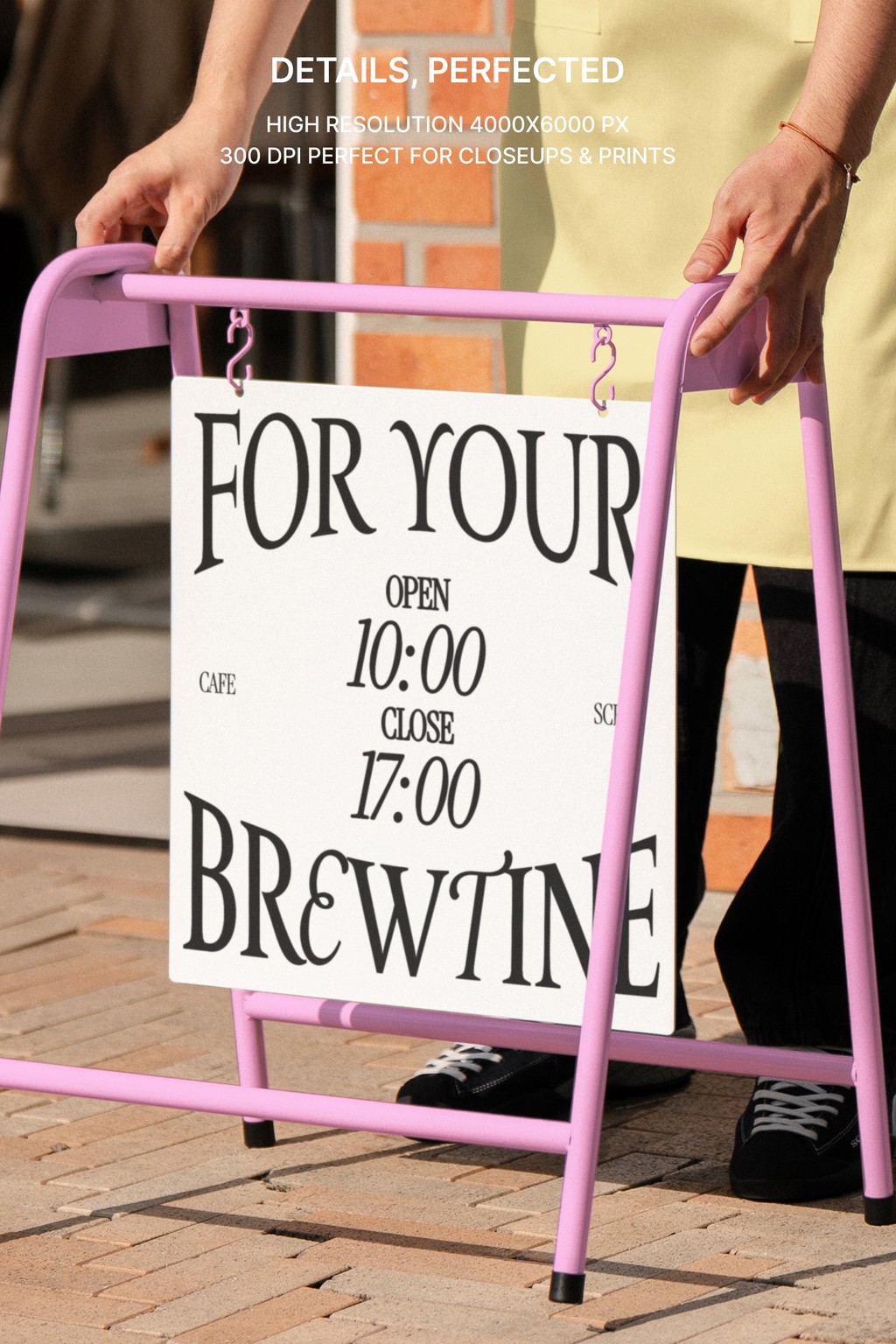 This S#4 FYB Sign 01 Mockup is available as a layered PSD file and is easy to customize. You can insert your sign panel design and cap design through the embedded Smart Object and adjust the sign frame color, T-shirt & apron colors.